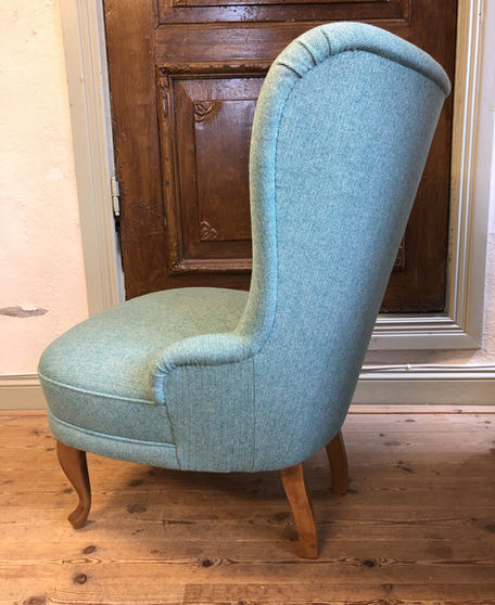 Nu finns denna Emmafåtöljen till salu. Nyproducerad och stoppad med kallskum. Den är klädd i ett fint fiskbensmönstrat ulltyg (100% ull) ifrån Delius.